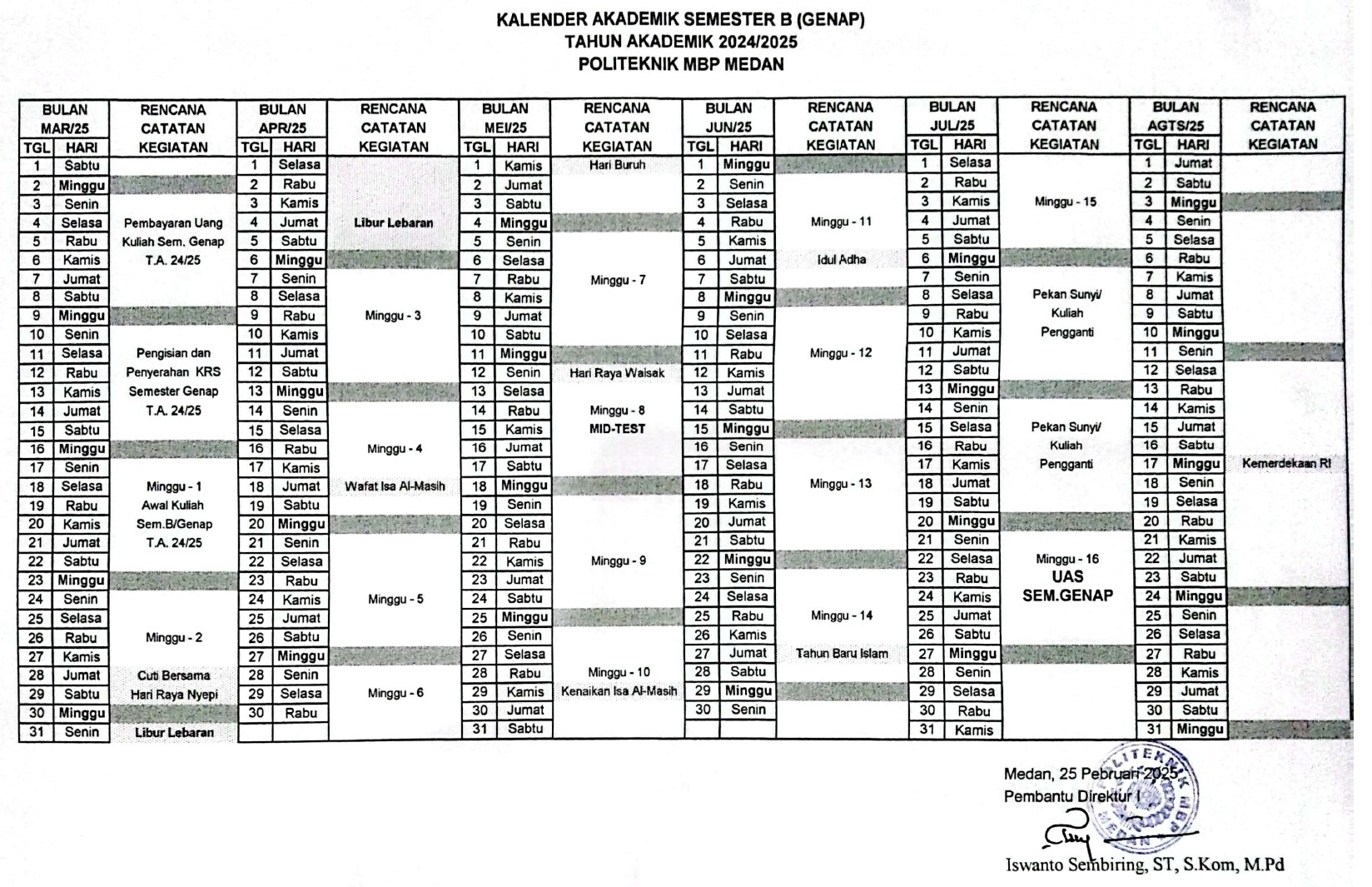 Kalender Akademik Semester B (Genap) Tahun Akademik 2024/2025 Politeknik MBP Medan