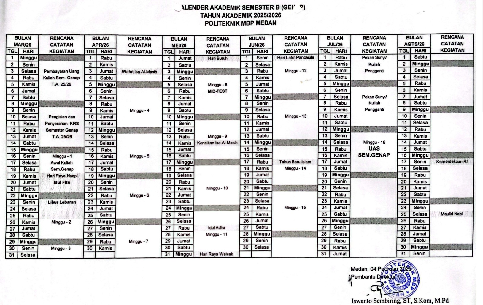 Kalender Akademik Semester Genap T.A. 2025-2026